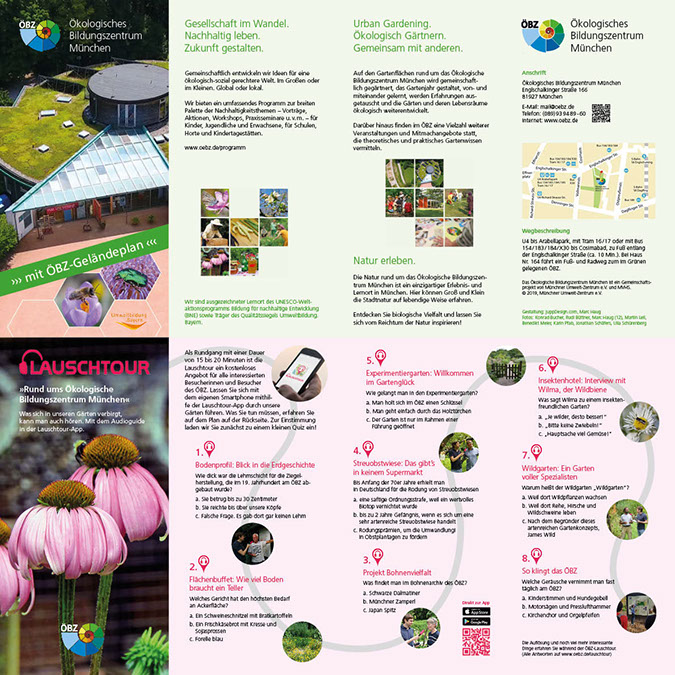 Faltplan Gestaltung eines achtseitigen Info- und Audioführers im Taschenformat mit allgemeinen Hinweisen zu Sinn und Zweck des Bildungszentrums, einem Lauschtour-Quiz